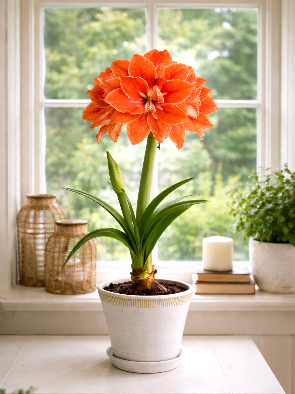 Sturdy stems emerge cleanly from the bulb and support the flowers without staking. Several blooms develop per stem, opening gradually to prolong the flowering period. With its balanced height and upright habit, Double Minerva fits easily into a wide range of indoor settings, from windowsills to tables.